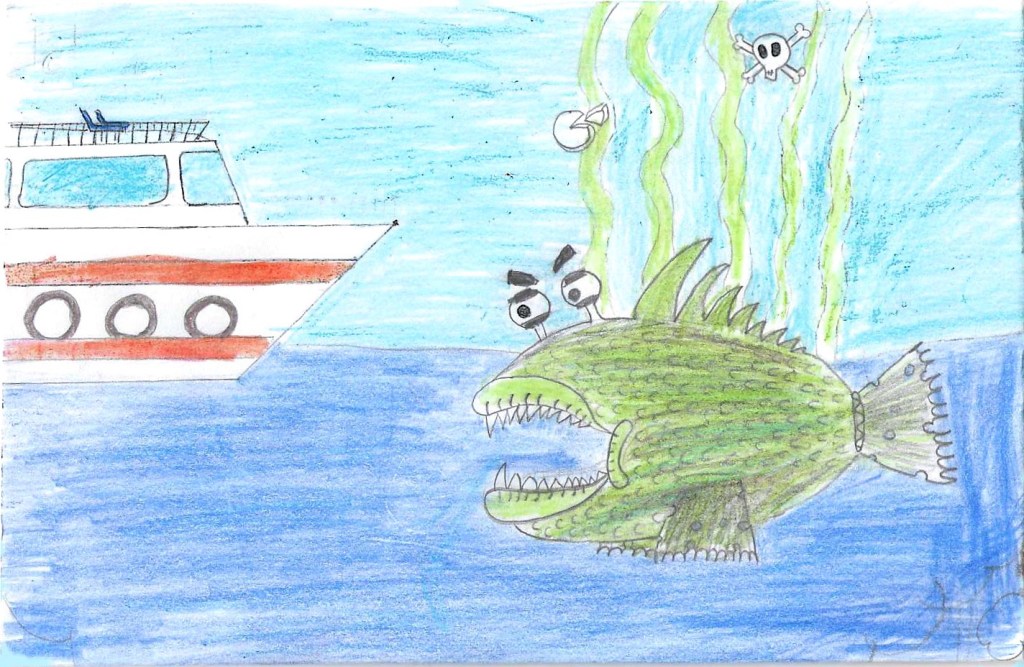 Cela faisait déjà 3 heures que nous naviguions sur l’eau, et moi j’avais l’impression que cela ne faisait que 3 minutes. C’était incroyable, grâce à l’eau transparente j’ai vu la carène du bateau et la fosse des Marianne. Je ne vais pas vous mentir : j’ai aussi eu le mal de mer. Quelques minutes plus tard, mon père jeta l’encre et ma mère sortit de son panier le goûter. Comme j’étais curieuse, j’ai demandé à ma grand-mère un peu sorcière où nous étions et elle m’a répondu ceci : « Nous sommes sur le territoire de chasse du fameux et gigantesque Gorgonzola. Fais ton testament ma petite, car si tu sens une mauvaise odeur, c’est le signe que la fin est proche ! » Puis elle partit s’allonger sur un transat. Bizarre, mais je n’ai pu enlever ces mots de ma tête.
