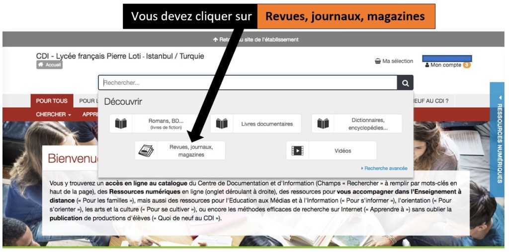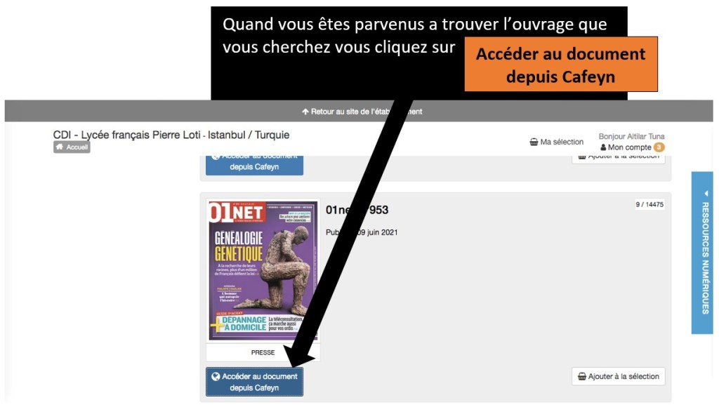 Maintenant, nous allons vous montrer comment faire pas à pas. Pour cet exemple, nous allons essayer de lire le magazine 01net (no. 953) en ligne. Vous devez, avant toute chose, vous être connecté à votre compte ENT avec vos codes élèves, puis accéder à esidoc comme indiqué dans la partie de l’article sur esidoc.