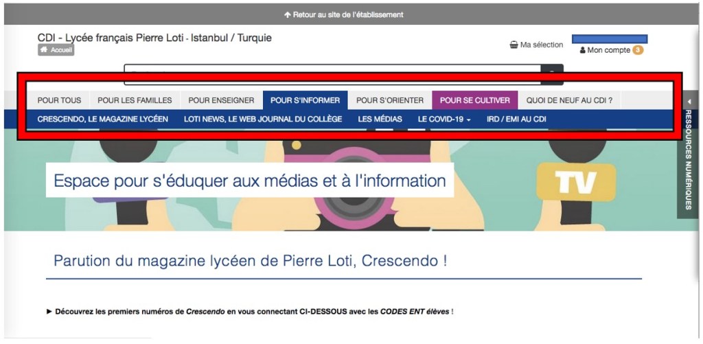 esidoc vous permet également d’accéder à des Ressources numériques en ligne (onglet déroulant à droite), des ressources pour vous accompagner dans l’Enseignement à distance (« Pour les familles »), mais aussi des ressources pour l’Education aux Médias et à l’Information (« Pour s’informer »), l’orientation (« Pour s’orienter »), les arts et la culture (« Pour se cultiver »), ou encore les méthodes efficaces de recherche sur Internet (« Apprendre à ») sans oublier la publication de productions d’élèves (« Quoi de neuf au CDI »).