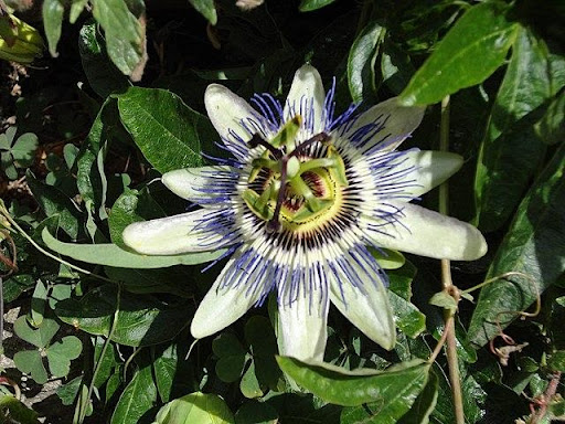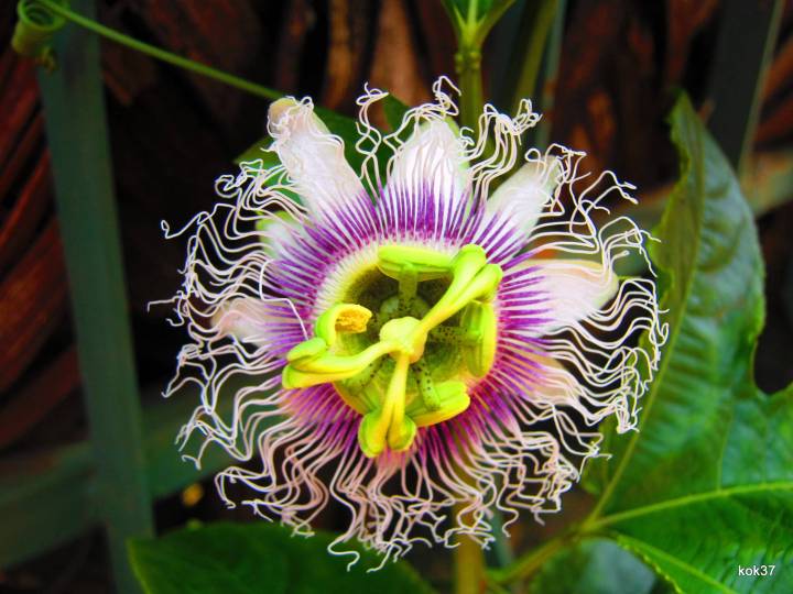 La fleur du fruit de la passion, de couleur pourpre et blanche, peut faire de 3 à 7 cm de diamètre. Les fruits sont des baies, de la taille d’un gros œuf (jusqu’à 5 cm de long), dont la peau est plus ou moins fripée, de couleur jaune à pourpre selon les variétés. A l’intérieur, le fruit a de nombreuses graines noires entourées d’une pulpe appelée arille : le goût est doux et acidulé.