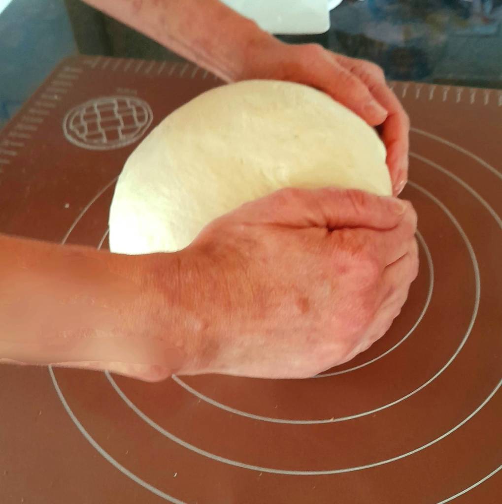 - Lorsque la pâte est assez gonflée, saupoudrez-la de farine et pétrissez-la encore une fois.