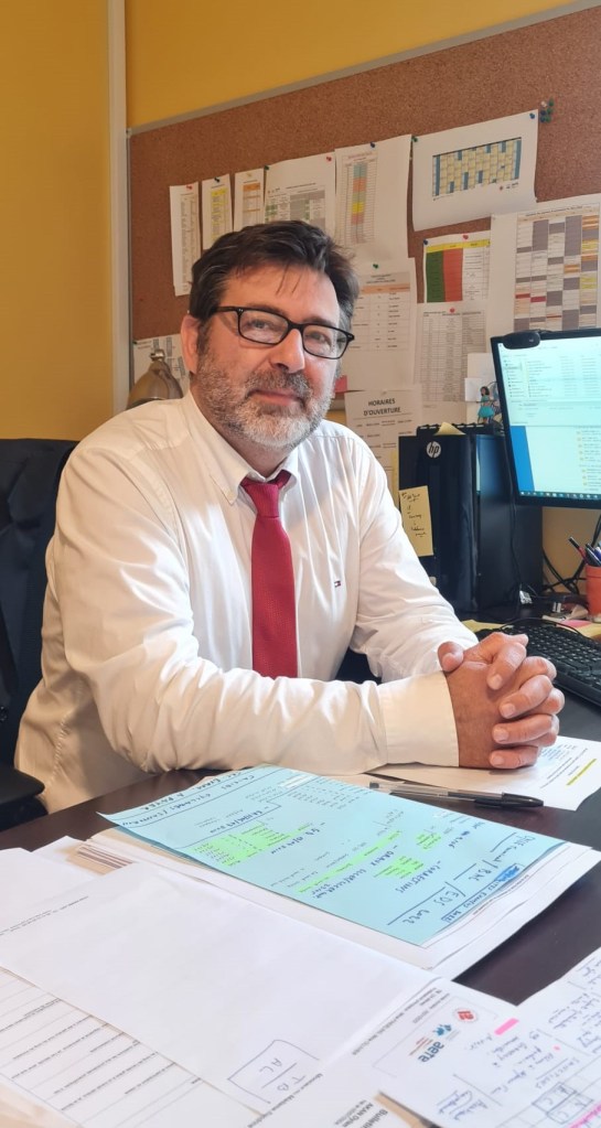 Le proviseur adjoint, M. Landolfi : Oui, c’est très compliqué. Et effectivement, ça détermine une grande partie de l’année pour les élèves, pour les enseignants et tout le monde dans l’établissement, et aussi pour les parents. C’est un poste et un rôle qui est souvent un petit peu chargé, surtout au lycée. Il y a beaucoup, beaucoup de choses qui arrivent tous les jours en fait, toutes les semaines, tous les mois, avec un rythme souvent haché et fractionné, qui est aussi celui de la gestion du quotidien et des incidents qui arrivent, par exemple s’il y a un problème dans une classe. Évidemment, la vie scolaire [le BVS] avec les professeurs sont en première ligne. Mais le proviseur adjoint est forcément là aussi s’il y a une régulation à faire. L’adjoint du chef d’établissement, en fait, va s’occuper de tout ce qui est l’établissement à l’intérieur des murs. Après, un proviseur adjoint ou un chef d’établissement va conduire des projets -on dit piloter- ce qui veut dire gérer, commander, impulser ou encore être à l’initiative de projets pour l’établissement, pour les élèves, avec les équipes pédagogiques et éducatives. Et ça, effectivement, ça permet aussi au proviseur adjoint de sortir de l’établissement et d’aller au-delà de l’établissement, c’est-à-dire de ne pas rester uniquement dans l’établissement et d’aller sur ce qu’on appelle le territoire. Le territoire, ça peut être la ville quand on est en France, un département, une académie, une zone à l’étranger, dans l’AEFE. C’est stimulant.