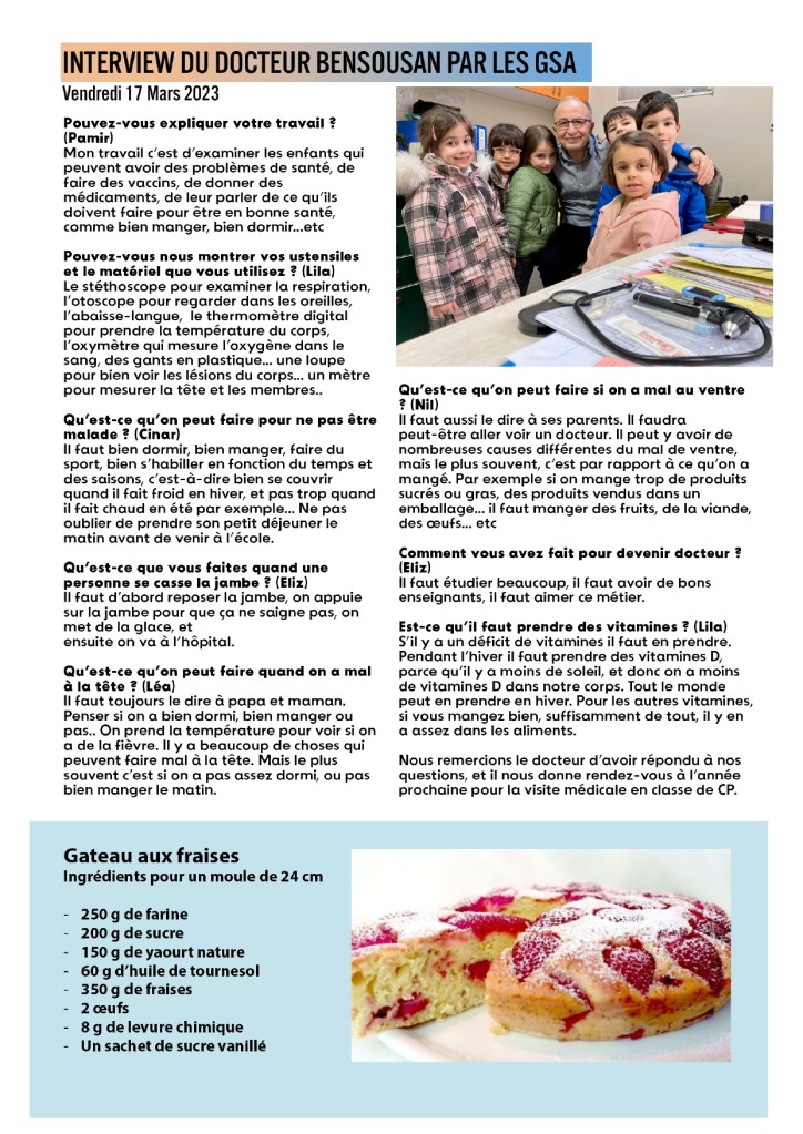 Et nous avons pu découvrir également le journal des GSA : Papillon ! Nous avons feuilleté deux numéros imprimés, contenant chacun un logo de papillon dessiné par un élève. Le journal comprenait des sujets divers : la présentation des activités et projets faits par les GS, des interviews (avec le directeur, M. Carré notamment), des jeux, et aussi… des recettes !