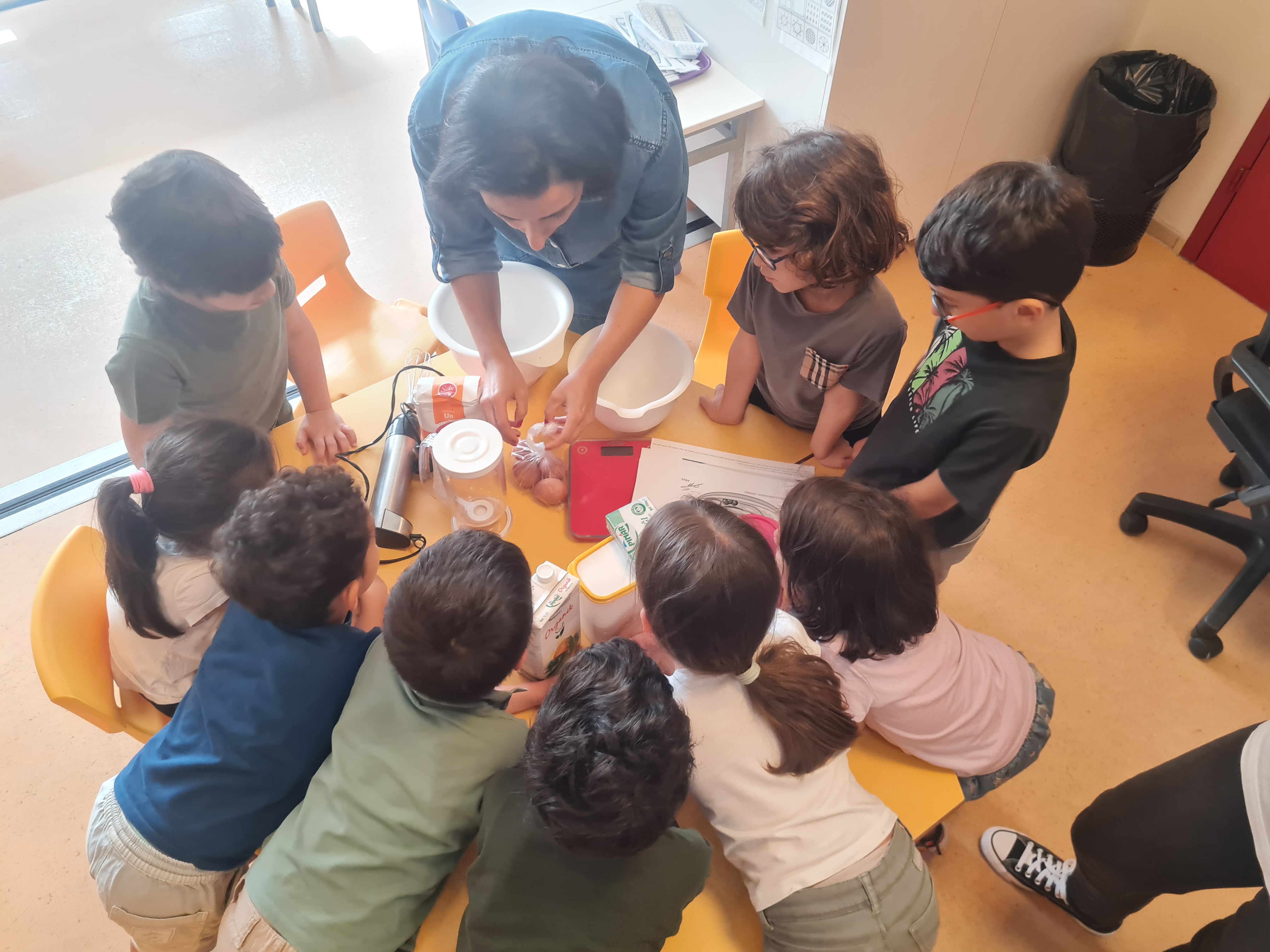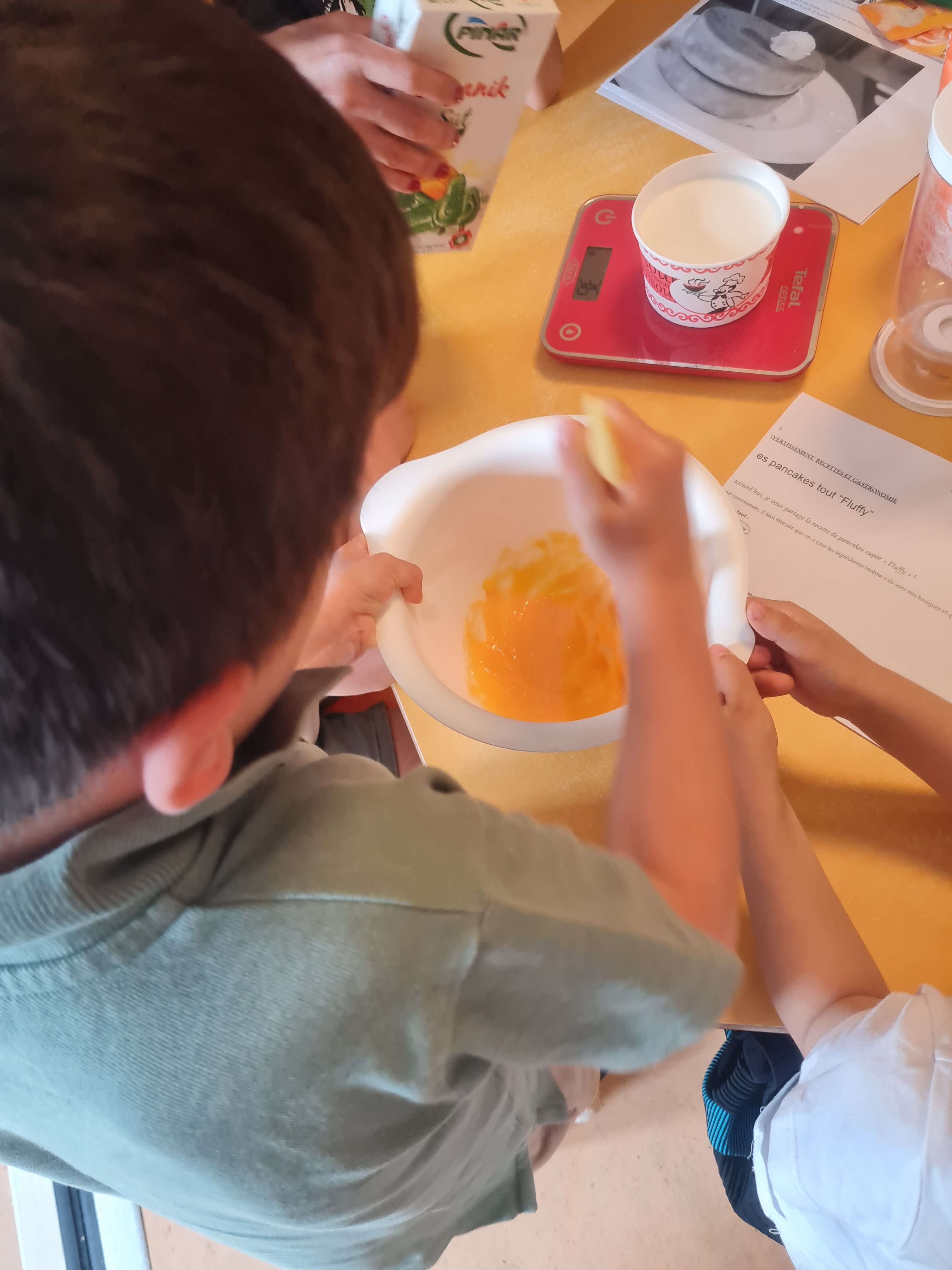 Tout d’abord, nous avons regardé les ingrédients nécessaires pour la confection des pancakes : farine, lait, levure, sucre… Ensuite, nous sommes passés à la fabrication de la pâte en mettant ensemble ces ingrédients et en mélangeant bien. Il y a eu beaucoup d’éclaboussures !