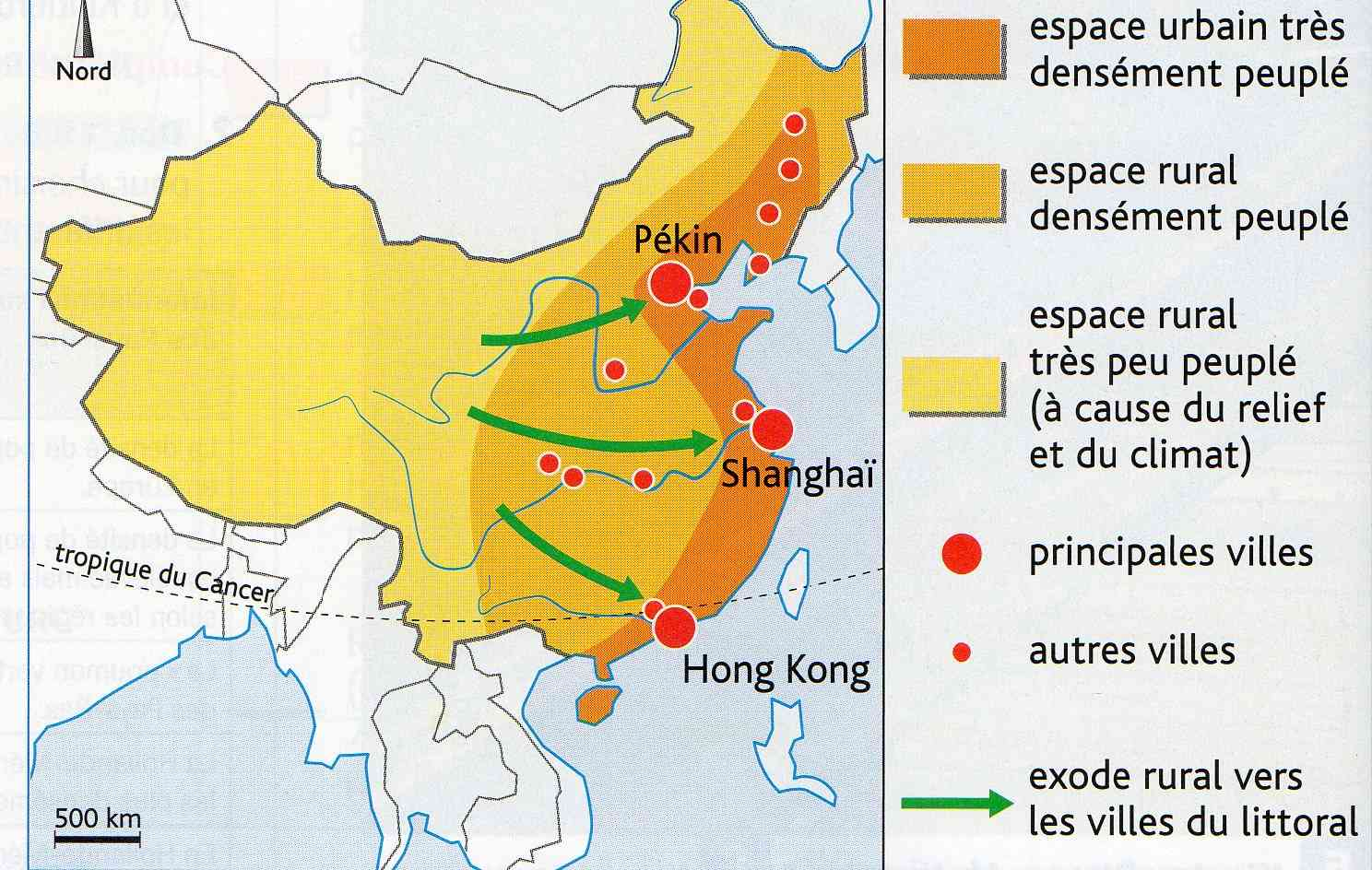 La Chine possède 33 provinces, 2 420 comtés et 32 944 villes. C’est un pays d’Asie d’une superficie de 9 596 361 km² (densité d’environ 141 hab./km²). Sa population était de 1,412 milliards d’habitants au dernier recensement. Cette population est répartie de façon inégale pour des raisons naturelles, dues en particulier aux montagnes de l’Himalaya, une zone très froide, et au désert de Gobi. La capitale de la Chine est la ville de Pékin qui compte 19.610.000 habitants.