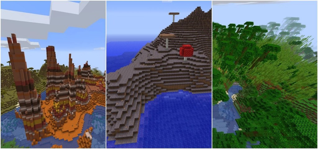 À chaque biome correspond un environnement particulier : forêts, jungle, toundra, prairie, désert, badlands… Si certains blocs comme la terre sont communs à de nombreux biomes, d’autres comme le sable rouge ne se trouvent que dans des biomes précis (“badlands” dans le cas du sable rouge).