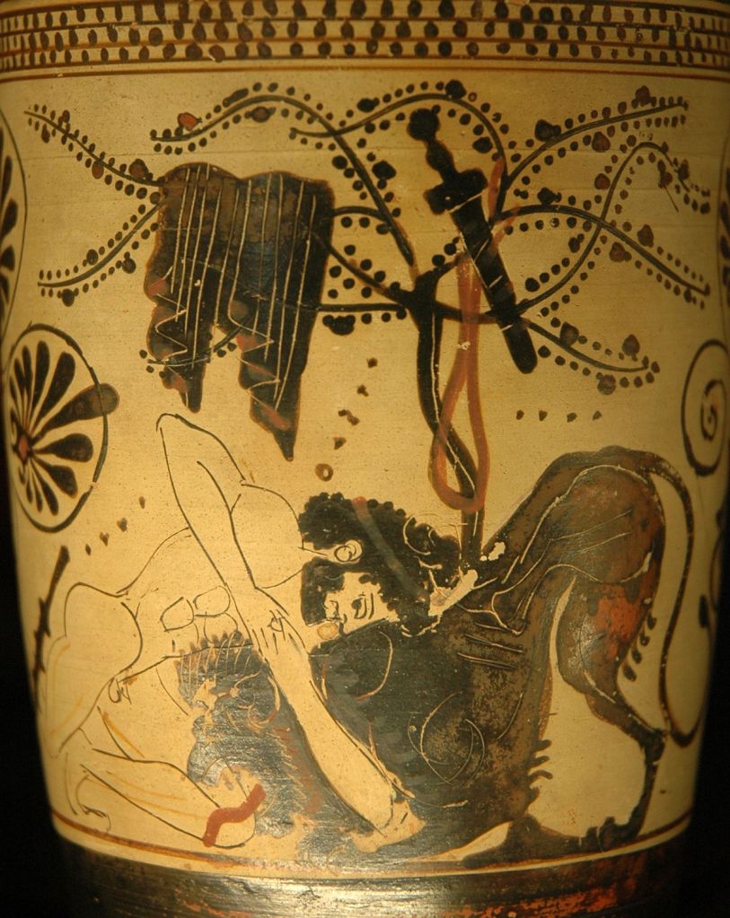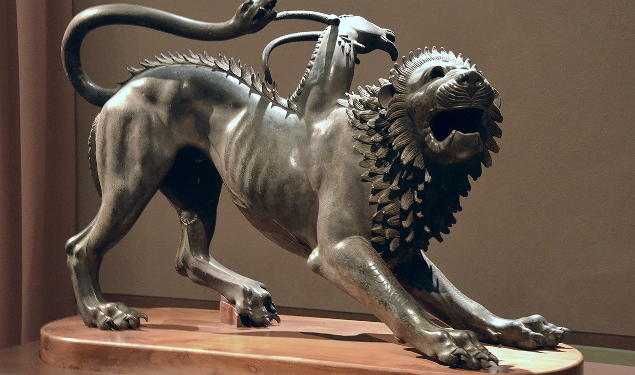 Dans la mythologie grecque, la Chimère est une créature monstrueuse, fille de Typhon et d’Échidna. Elle est souvent décrite comme ayant la tête et le corps d’un lion, une tête de chèvre sur le dos, et une queue se terminant par une tête de serpent. La Chimère crachait du feu et semait la terreur dans la région de Lycie. Le héros Bellérophon, monté sur le cheval ailé Pégase, fut chargé de tuer la Chimère. Grâce à son courage et à la rapidité de Pégase, Bellérophon réussit à terrasser le monstre en lui enfonçant une lance de plomb fondue par ses flammes. La Chimère symbolise le chaos et la terreur, ainsi que la capacité des héros à surmonter des menaces apparemment invincibles.