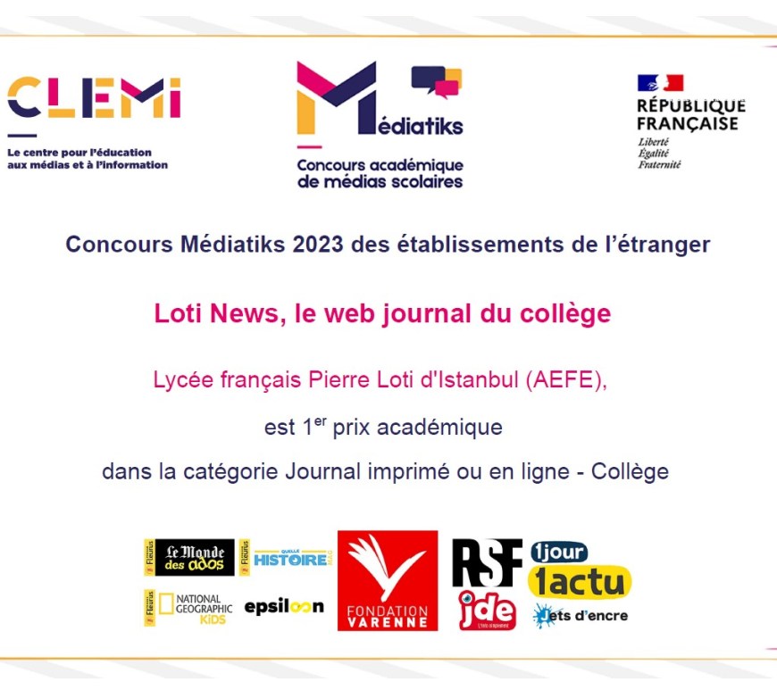 L’équipe de Loti News vient d’être désignée lauréate du deuxième prix du journal imprimé ou en ligne – Collège 2022 au concours académique de médias scolaires « Médiatiks International », organisé par le CLEMI ! Continuer de lire Loti News lauréat du Premier Prix Médiatiks 2023 des établissements de l’étranger !